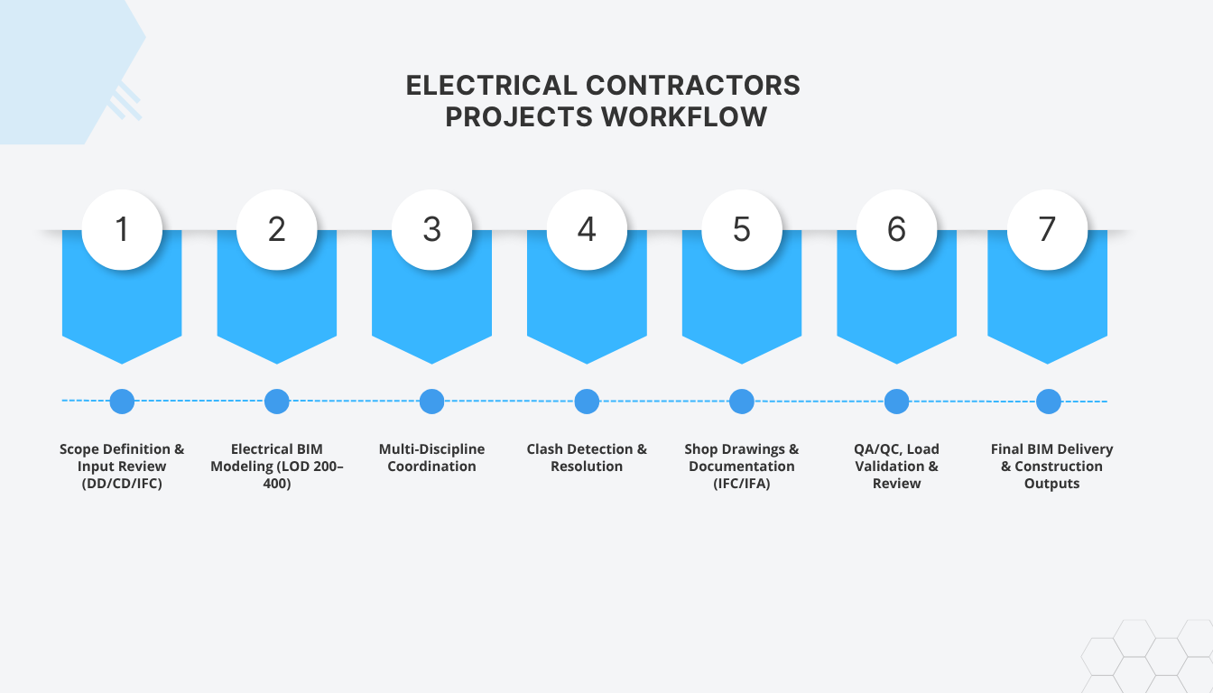 The workflow for an electrical project may include system design coordination, BIM modeling, clash detection, shop drawing development, construction, and finally, construction support.