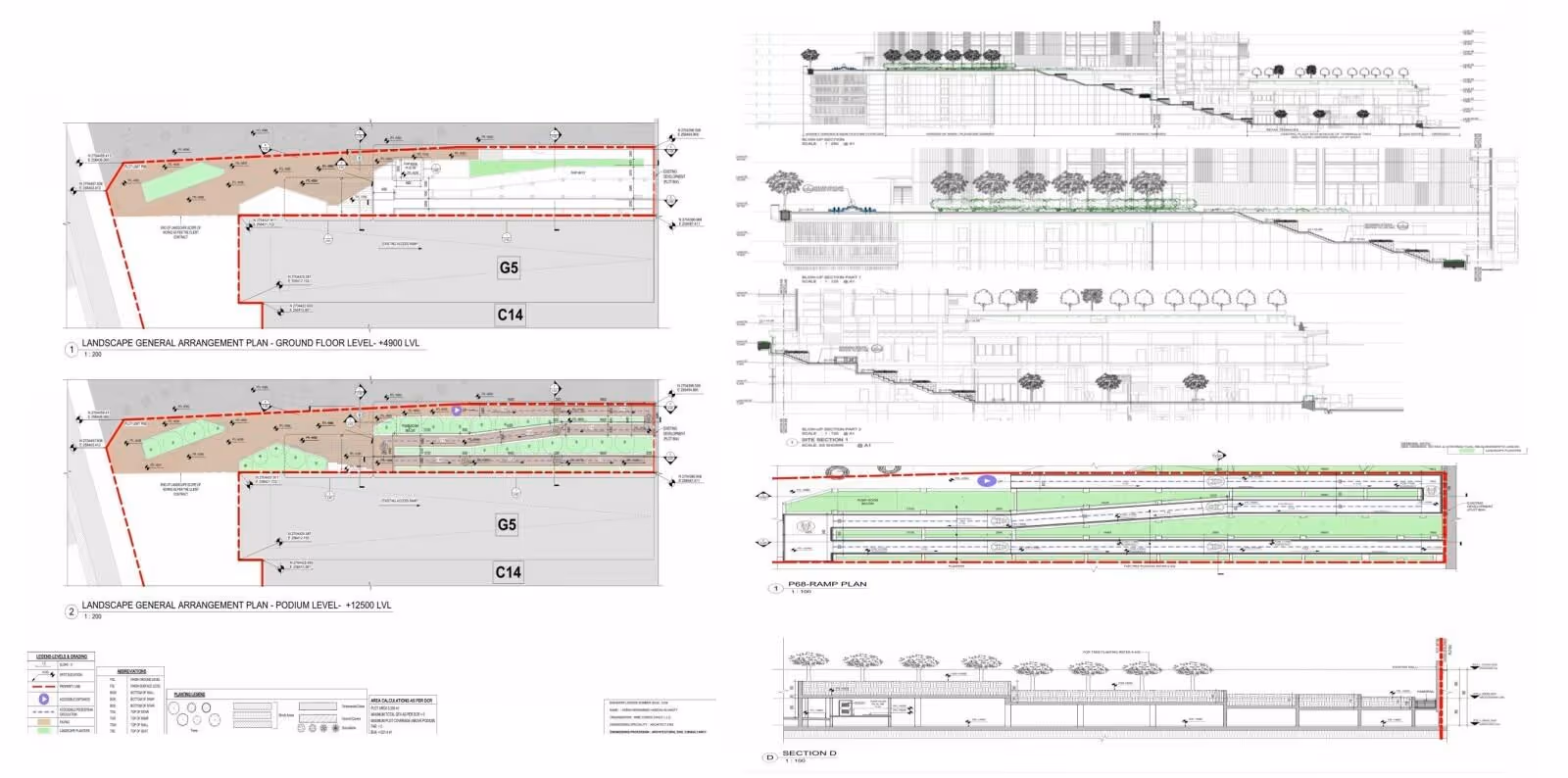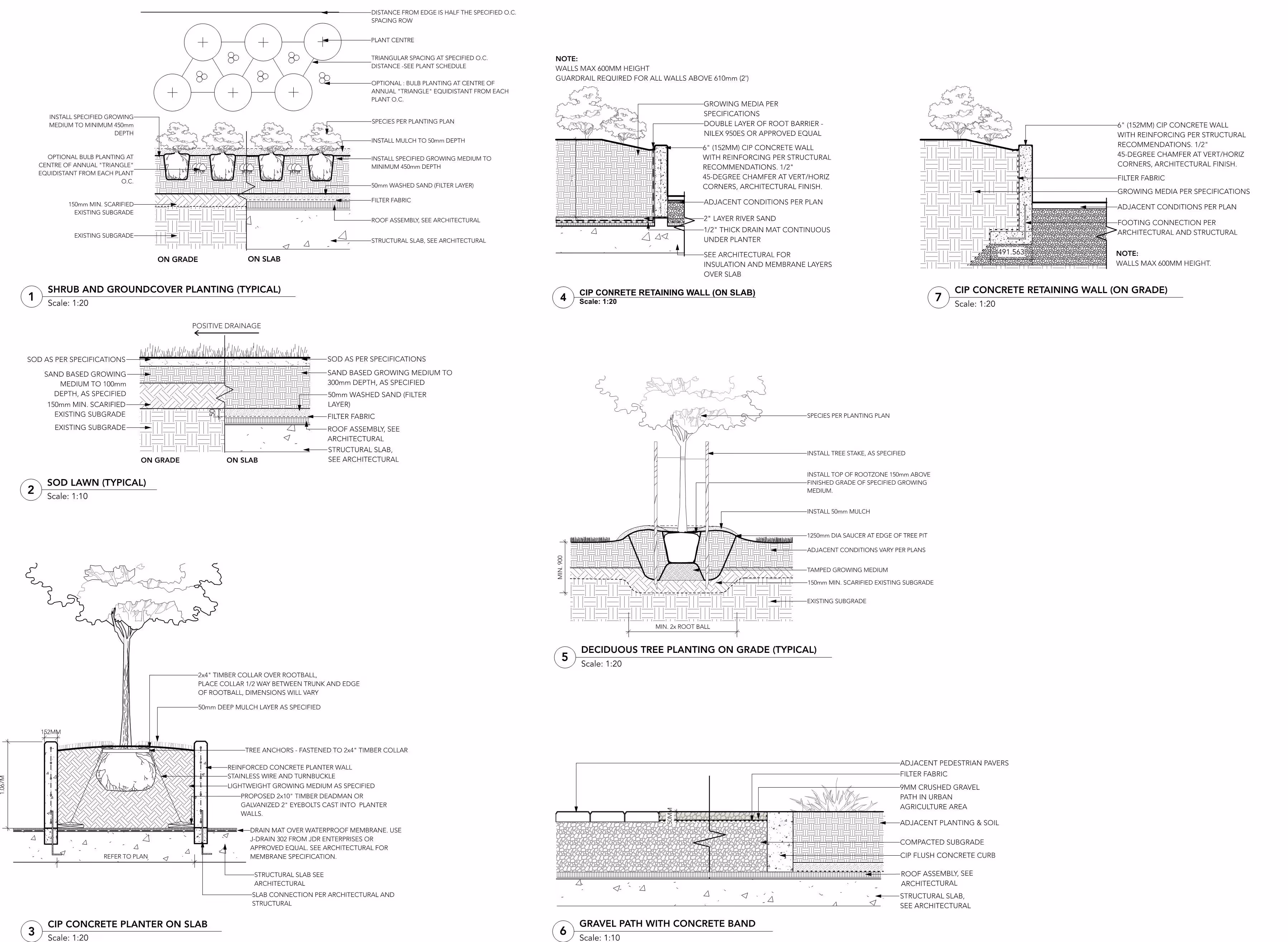 Plans, sections, planting details, grading layouts, hardscape details — all tailored to local authority requirements for approvals.